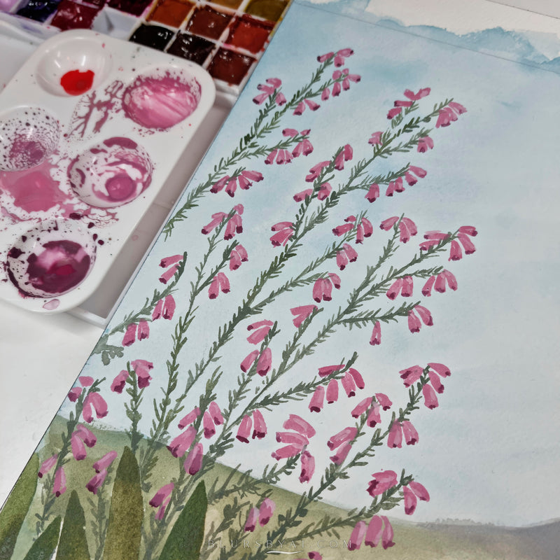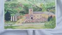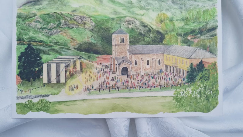 Reproducción artística de mi acuarela original en la que he ilustrado la plaza de mi pequeño pueblo, Los Barrios de Gordón, en fiestas.